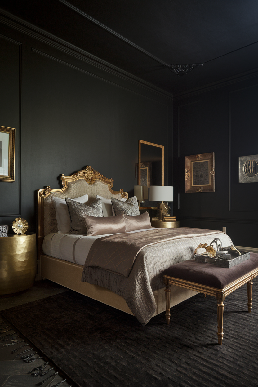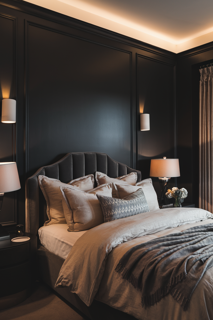 For a bold yet elegant look, consider painting your bedroom walls black. Black walls are the ultimate in sophistication, creating a dramatic, intimate setting. Pair this striking backdrop with crisp white bedding to create a high-contrast design that feels both edgy and clean. The combination of black and white not only makes a bold statement but also helps create a peaceful, calming environment. Use the contrast to highlight architectural features, such as intricate moldings or elegant bed frames. Complete the look with gold or silver accents in your lighting fixtures or artwork to add a touch of glamour.