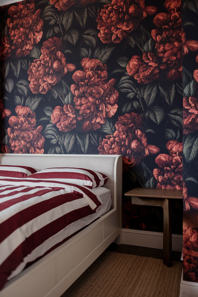 Floral wallpaper with dark, moody backgrounds, such as black, deep navy, or charcoal, creates a striking, dramatic atmosphere. This design choice adds a touch of vintage charm while maintaining the edgy, intimate vibe of a moody bedroom. The bold floral patterns contrast beautifully against the dark walls, offering a visually interesting focal point for the room. Choose wallpapers with muted colors or metallic accents for added luxury, and pair them with simple, neutral furniture to prevent the space from feeling overcrowded. This design works especially well in smaller bedrooms where the wallpaper can make a big impact without overwhelming the room.