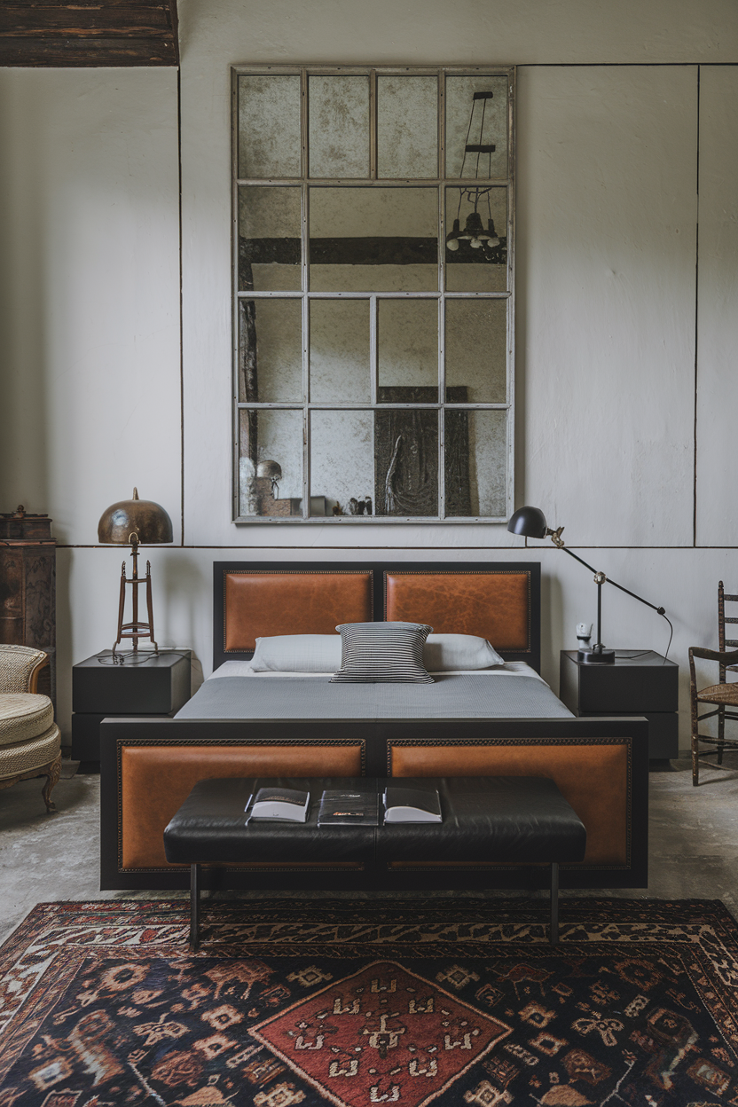 Leather furniture is the epitome of luxury and texture. When used in a moody bedroom, leather pieces such as an armchair, ottoman, or even a leather-upholstered bed frame can provide an elegant contrast to softer fabrics. Dark brown or black leather works particularly well in these types of rooms, grounding the design and adding a sense of warmth and sophistication. Leather naturally ages well, meaning that over time, it only gets better with use, making it a timeless investment for your bedroom. Pair with soft, textured throws and velvet pillows to create a comfortable, layered aesthetic that balances both elegance and comfort.