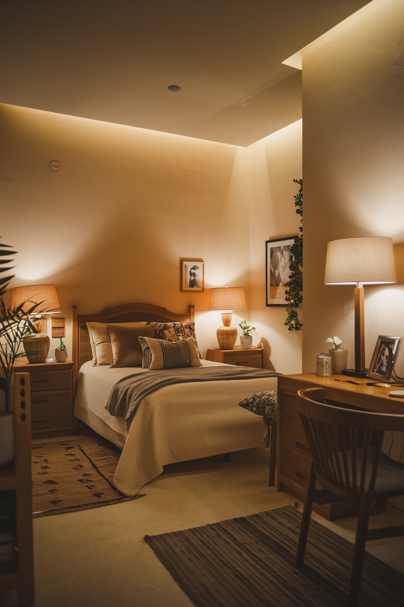 Lighting is one of the most important aspects of creating a moody atmosphere. Soft, warm lighting, especially when controlled by dimmer switches, lets you adjust the ambiance to suit your mood. Instead of harsh overhead lights, incorporate table lamps, wall sconces, and pendant lights that cast a gentle, even glow. Using light fixtures with fabric lampshades or frosted glass can further soften the light, contributing to a serene environment. The ability to adjust the brightness ensures that your bedroom can shift from a bright, energizing space during the day to a cozy, intimate retreat at night. Consider adding candles or fairy lights for additional soft illumination that brings a sense of calm.