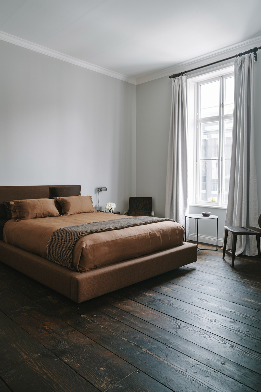 Dark wood flooring adds a layer of richness and texture to any room, particularly in a moody bedroom. The deep hues of dark oak, walnut, or mahogany bring warmth and depth to the space, grounding the design and adding an element of natural beauty. The texture of the wood creates visual interest and contrasts beautifully with soft, plush fabrics like velvet, linen, and cotton. Dark wood flooring can be further complemented by a cozy area rug in a neutral or contrasting color to help soften the look while also creating a tactile contrast that enhances the overall ambiance.