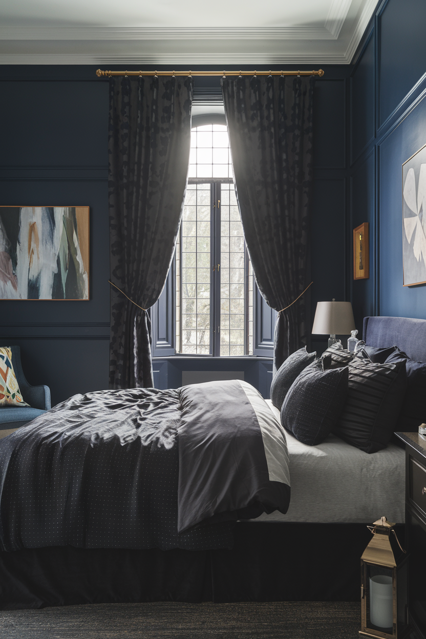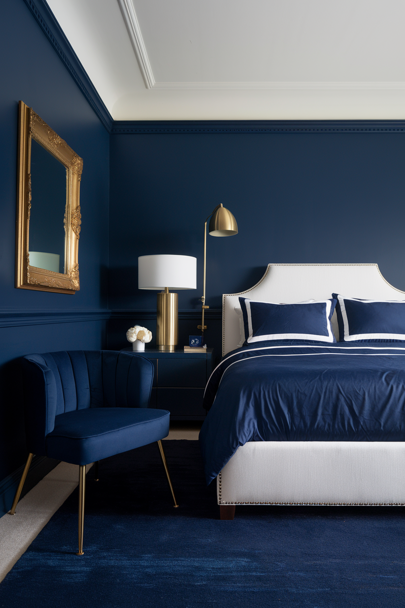 Navy blue is a timeless color that offers a serene, tranquil vibe, perfect for a bedroom retreat. This rich, dark blue envelops the room in depth and sophistication. Pair navy blue walls with gold accents, think brass light fixtures, gold-framed mirrors, or gold-tipped furniture legs, to introduce a luxurious, slightly glamorous touch to the space. The interplay of navy and gold creates a warm yet elegant atmosphere, with the gold accents subtly popping against the dark blue without overwhelming the senses. This design works especially well in larger bedrooms where you want to make a bold statement without sacrificing comfort.