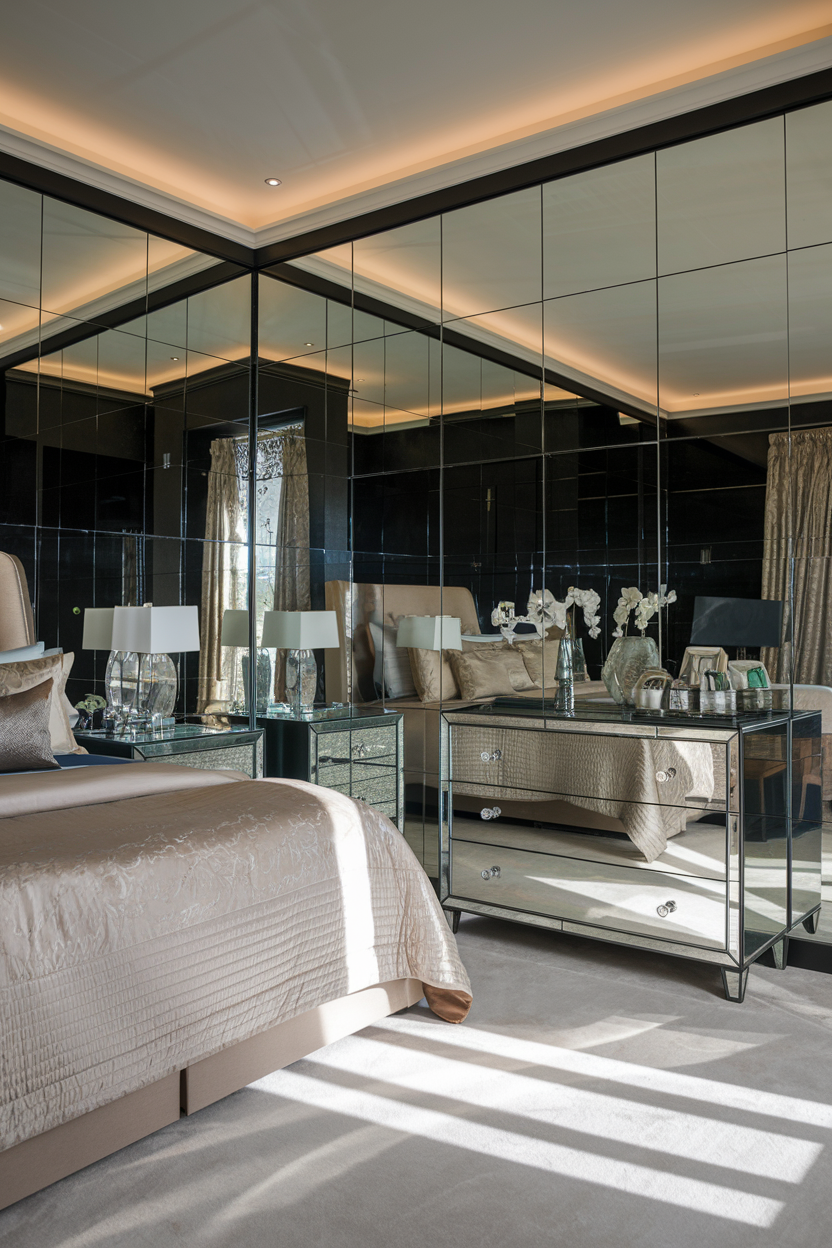 Mirrored surfaces are a clever way to add light and depth to a moody bedroom. While dark colors dominate the walls and furniture, mirrors reflect both natural light and the soft ambient lighting in the room, brightening up the space without compromising the intimate atmosphere. Consider incorporating a large mirrored dresser, reflective bedside tables, or a striking full-length mirror as a focal point in the room. The reflective surfaces will not only make the space feel more open but will also add an element of luxury and glam, ensuring that the bedroom remains chic while maintaining its cozy, moody charm.