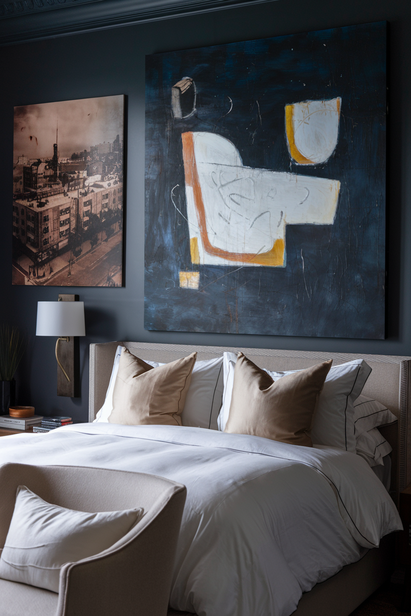 Art is a powerful way to introduce personality into any room, and in a moody bedroom, it can become a focal point that draws the eye. Large statement pieces, like abstract paintings, vintage photographs, or sculptural artwork, can add depth and intrigue to your walls. Dark or muted tones in the artwork complement the moody color palette of the room while offering a burst of creativity and personal expression. By selecting pieces that reflect your style, whether they’re moody landscapes, bold graphic designs, or personal photographs, you infuse the room with your unique personality, further enhancing its intimate and cozy atmosphere.