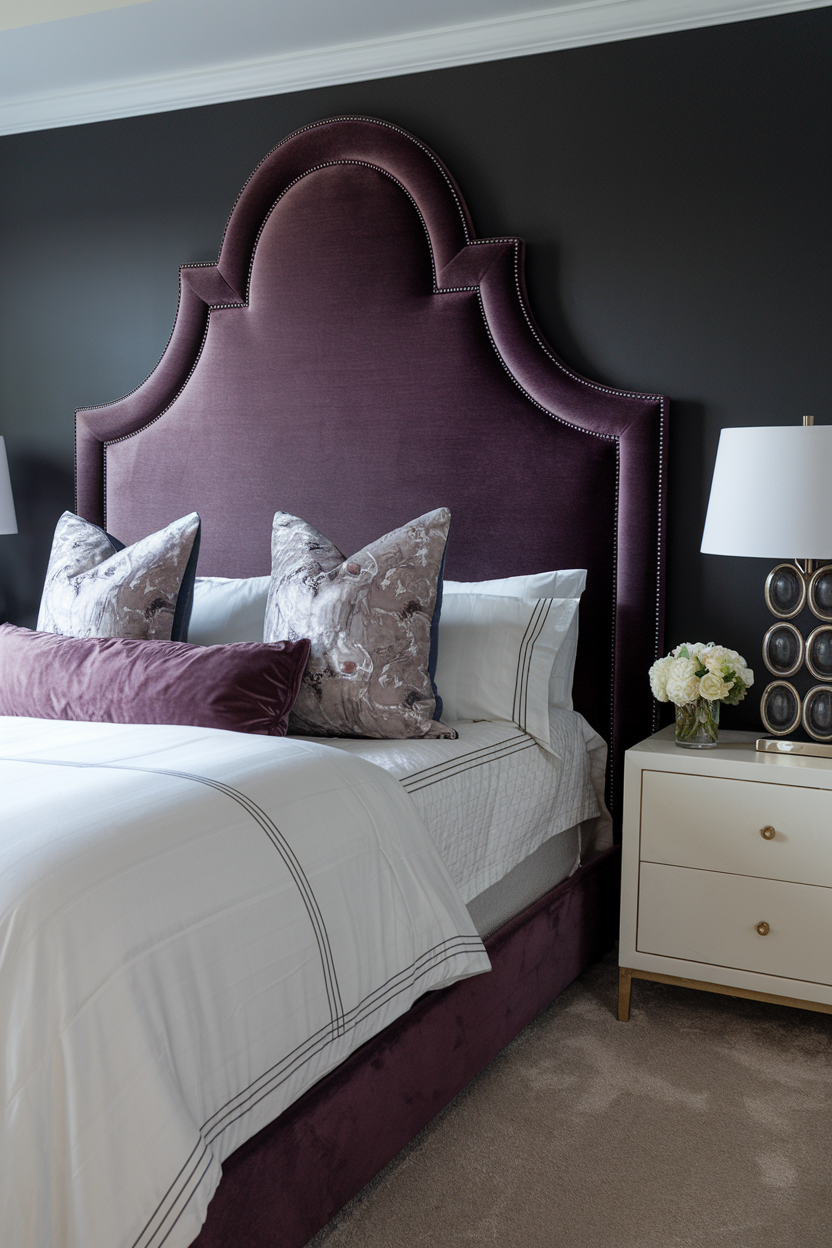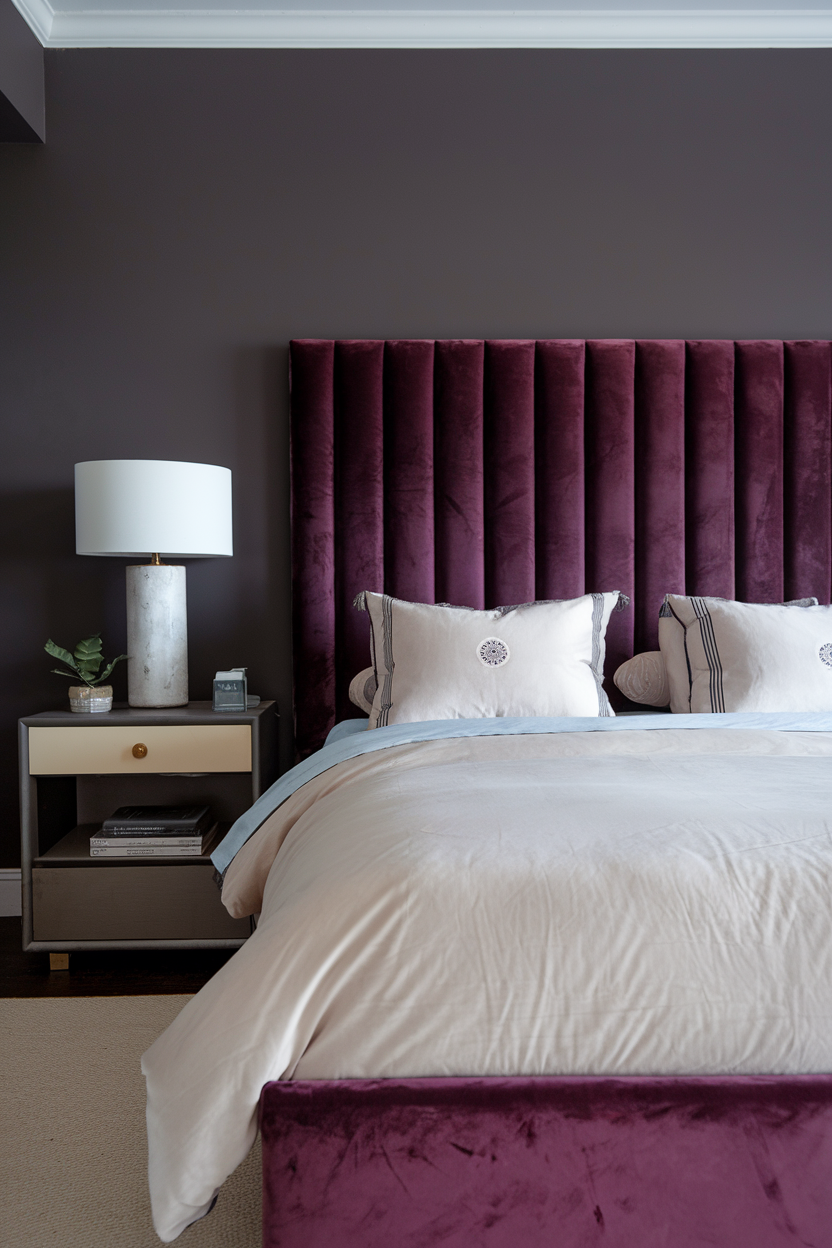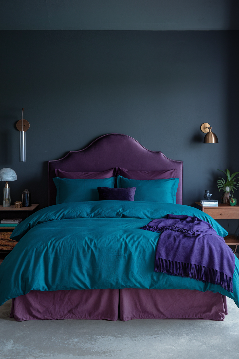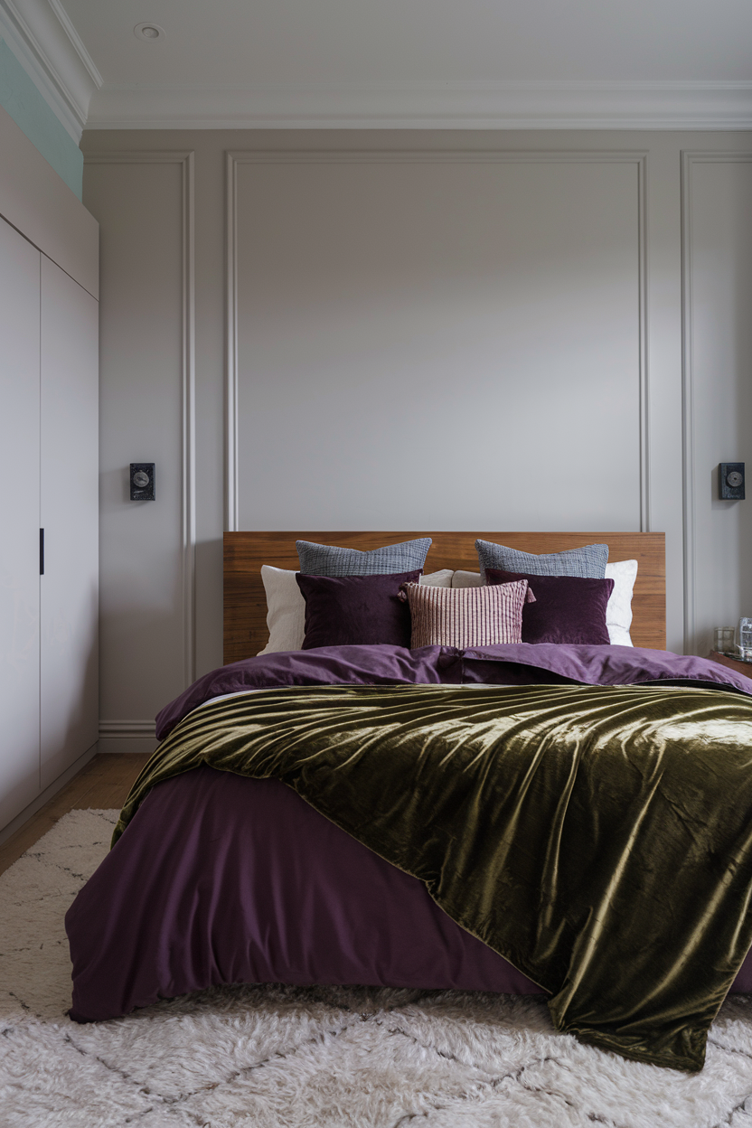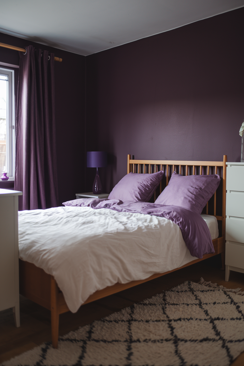 Dark purple is a rich, romantic color that brings an air of mystery and depth to any bedroom. The deep tones of purple, especially when used on walls or as the primary color for furniture, create a cozy and intimate atmosphere. This color evokes feelings of luxury, calm, and relaxation. To avoid the room feeling too heavy, balance the deep purple with lighter textures, like a soft ivory duvet or neutral throw pillows, and mix in metallic or neutral accents to keep the space from feeling too dark. Dark purple works particularly well with soft lighting, creating a glowing, ethereal effect perfect for winding down.