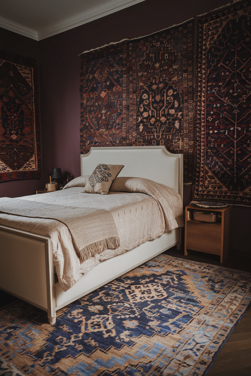 Vintage rugs are an essential element in creating a moody bedroom with both character and comfort. These rugs, often rich in color and intricate patterns, introduce texture, warmth, and a touch of history to your space. Whether you choose a Persian rug with deep reds and golds or a faded vintage runner with soft blues and grays, these pieces help anchor the room, grounding the dark tones of the walls and furniture. The intricate patterns and worn textures of vintage rugs add visual interest while offering a sense of comfort and nostalgia, creating a space that feels both timeless and cozy.