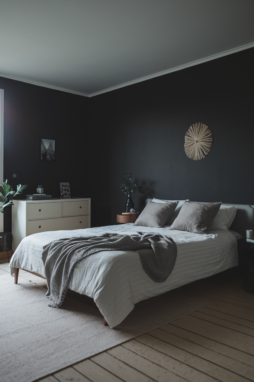 Charcoal walls provide the perfect backdrop for creating a moody atmosphere in any room. This deep, sophisticated color can envelop your space, creating a calming, cocoon-like feel. Pair it with soft, warm lighting from table lamps or sconces to add a layer of comfort and intimacy. The key is to avoid overly bright lights and instead focus on warm tones that illuminate without harshness. Layering plush bedding in lighter tones like cream or soft grey will provide a gentle contrast to the dark walls, keeping the room balanced and inviting without being overpowering.
