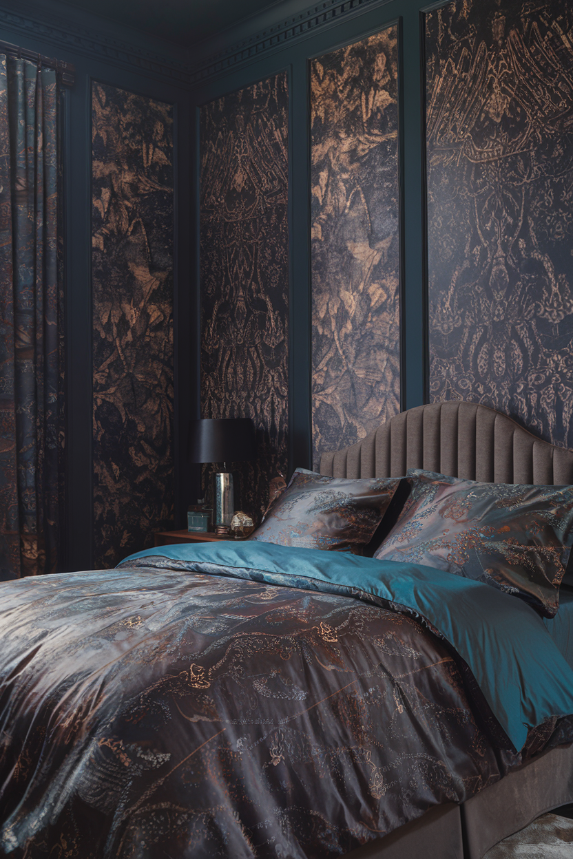 Textured walls are a great way to add depth and interest to a moody bedroom. Instead of keeping the walls plain, consider incorporating wallpaper with rich, dark colors or intricate patterns. Vintage-inspired wallpapers featuring deep florals, damask, or geometric shapes create a luxurious backdrop. Alternatively, textured wall panels made from wood, fabric, or plaster can add dimension and create a tactile element that enhances the room’s cozy atmosphere. A feature wall behind the bed, for instance, can act as a statement piece, adding drama and a unique focal point to the room.