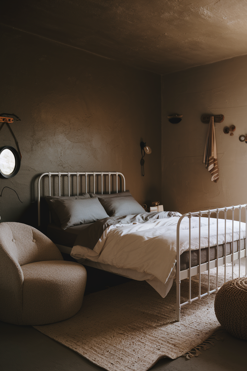 Incorporating industrial elements into your moody bedroom can add a layer of raw charm that perfectly complements dark and cozy tones. Exposed brick walls, metal bed frames, and unfinished wood details create an urban, rustic appeal that pairs beautifully with softer, more plush elements like velvet pillows or faux fur throws. The juxtaposition of these industrial materials with luxurious fabrics creates a balanced, moody atmosphere that feels both stylish and comfortable. Whether it’s a steel lamp, an iron bed frame, or industrial-style shelving, these touches can transform your bedroom into a sophisticated yet cozy retreat.