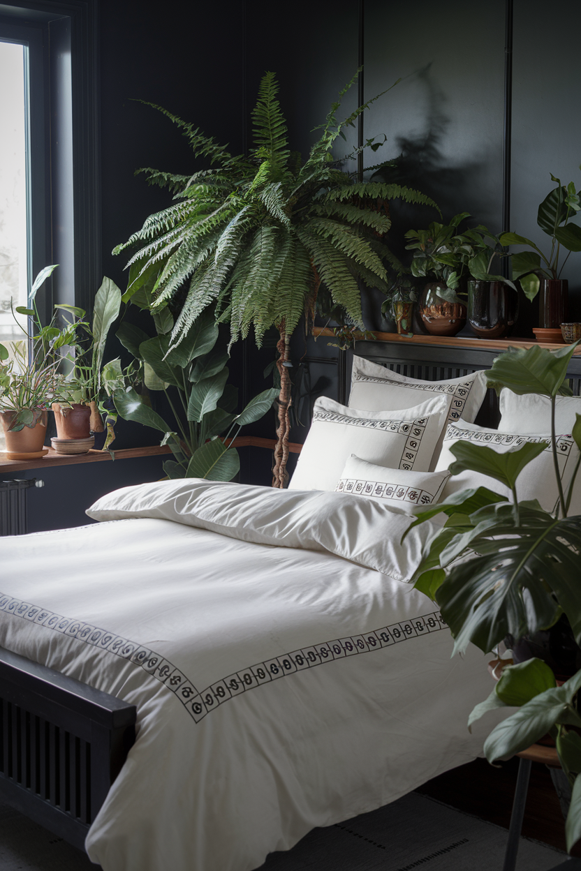 Indoor plants bring a fresh, organic element to a moody bedroom, offering a calming contrast to the darker tones of the decor. A large fern or a collection of smaller potted plants can soften the space, adding life and texture. The deep green hues of plants complement the moody color palette, while the natural texture of the foliage enhances the serene atmosphere. Place plants near natural light sources, like windows, to help them thrive, or use statement pots to match the room’s style. Not only do plants improve air quality, but they also introduce a calming connection to nature, promoting a sense of tranquility in your cozy, intimate bedroom retreat.