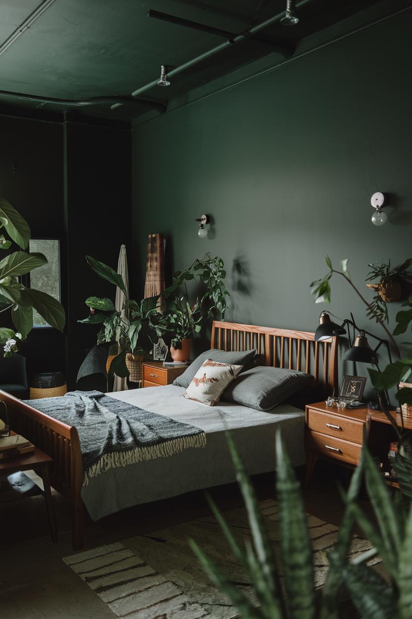 Dark green walls are perfect for creating a moody, nature-inspired bedroom. This deep hue evokes a sense of tranquility, helping you relax and unwind in your own space. The key to making dark green feel cozy is to introduce natural elements, such as wooden furniture, woven textures, and houseplants. A wooden bed frame or nightstand made from reclaimed wood will bring warmth to the room, while lush green plants add a pop of life and natural beauty. To avoid the room feeling too heavy, balance the green with neutral or light-colored bedding and accessories, and incorporate soft lighting to keep the atmosphere calm and serene.
