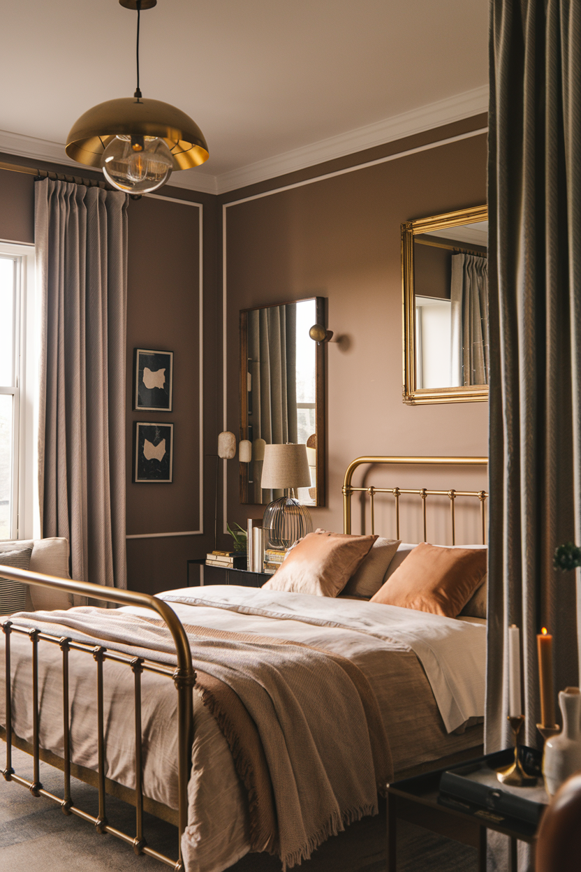 Taupe is a warm, neutral color that can serve as a perfect base for a moody bedroom. Its earthy undertones create a calming, serene atmosphere, ideal for unwinding after a long day. When paired with brass accents, such as a brass bed frame, light fixtures, or framed mirrors, it introduces a sophisticated, timeless elegance to the room. The warmth of taupe complements the golden hues of brass, resulting in a balanced, inviting design. To complete the look, incorporate plush fabrics like velvet cushions or a woven throw blanket, and keep the lighting soft and ambient to maintain the cozy, intimate atmosphere.