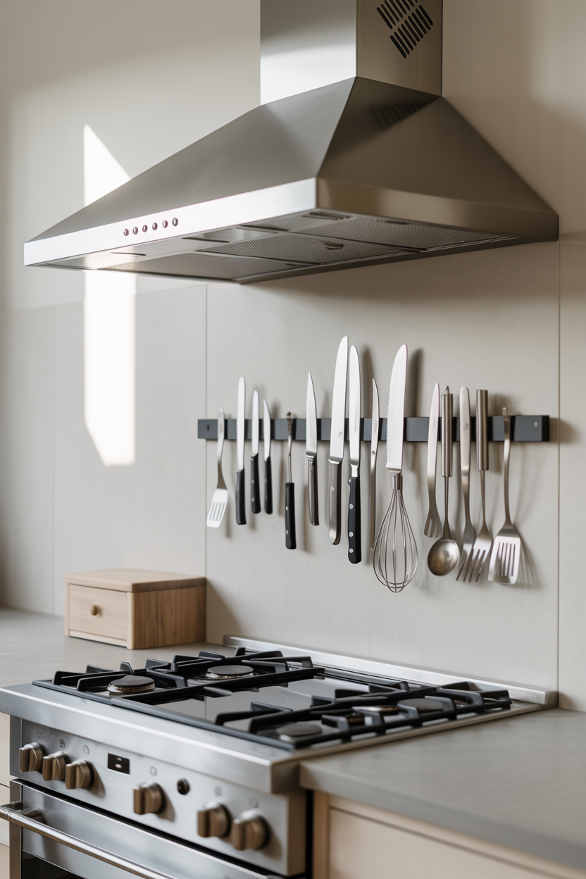 Free up valuable drawer and counter space by using magnetic strips to store metal kitchen tools. Mounted on your backsplash or wall, these strips hold knives, scissors, and other utensils securely in place while keeping them within easy reach. It’s a practical and visually appealing storage method that adds a professional, organized look to your kitchen and saves space at the same time.