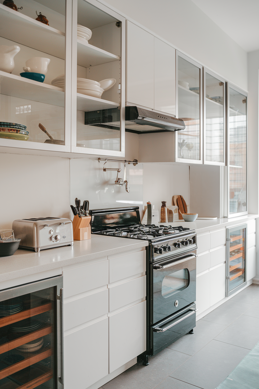 Replacing solid cabinet doors with glass fronts is a powerful visual trick that helps make a small kitchen appear more spacious. Glass doors create depth by allowing the eye to travel through the cabinet, opening up the space. They also reflect light, further brightening the room. Choose clear glass for a crisp look or frosted glass for added privacy. Keep items inside organized and aesthetically pleasing to maintain a clean and intentional feel.