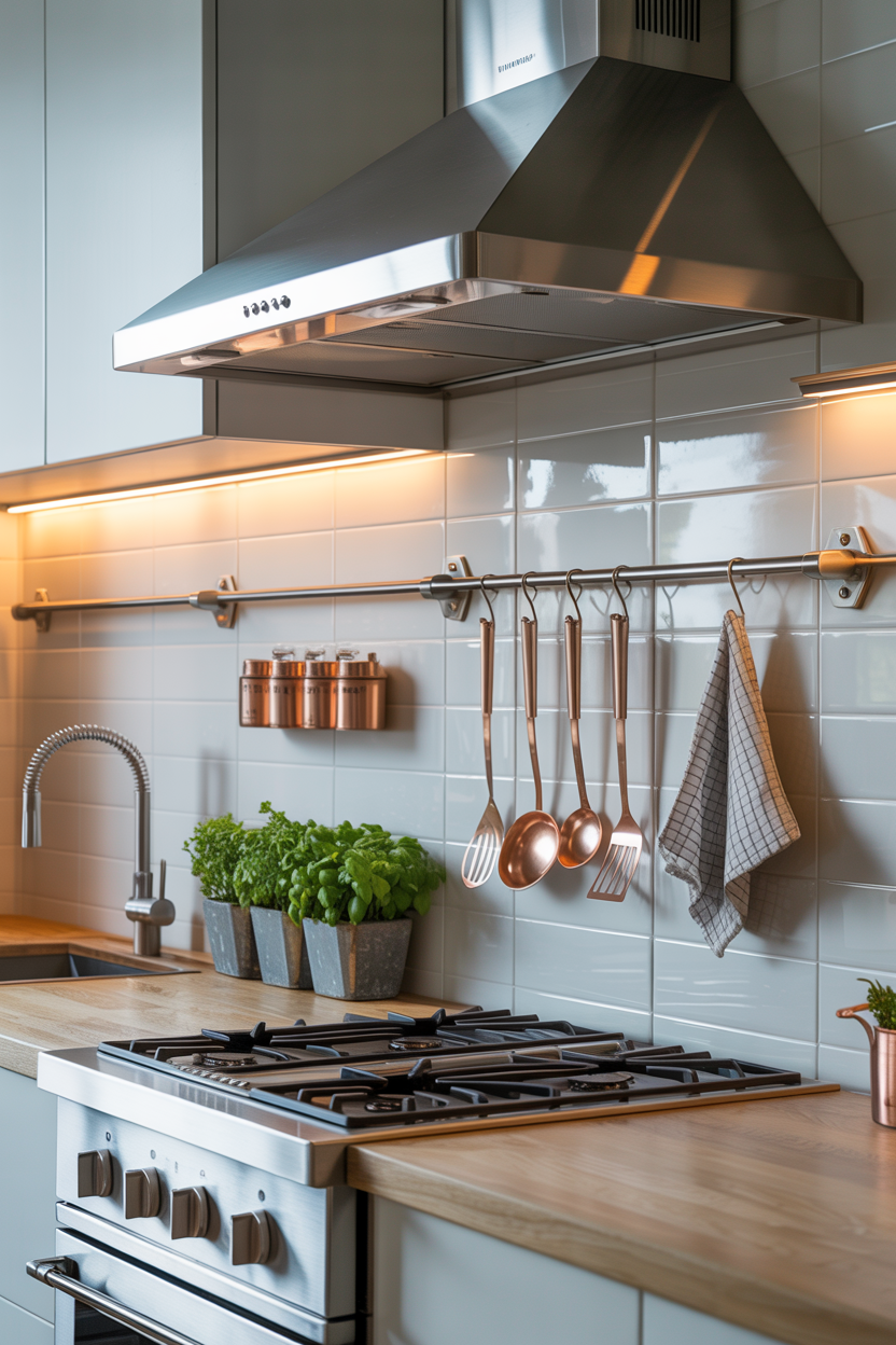 Installing a slim rail system along your backsplash is an efficient way to keep frequently used items within easy reach. These systems typically include hooks, baskets, and shelves for hanging utensils, spices, dishcloths, or even small potted herbs. A mounted rail maximizes vertical space and helps reduce countertop clutter. It also adds a custom, chef-inspired touch to your kitchen. Choose materials that match your existing hardware to create a cohesive, purposeful look.