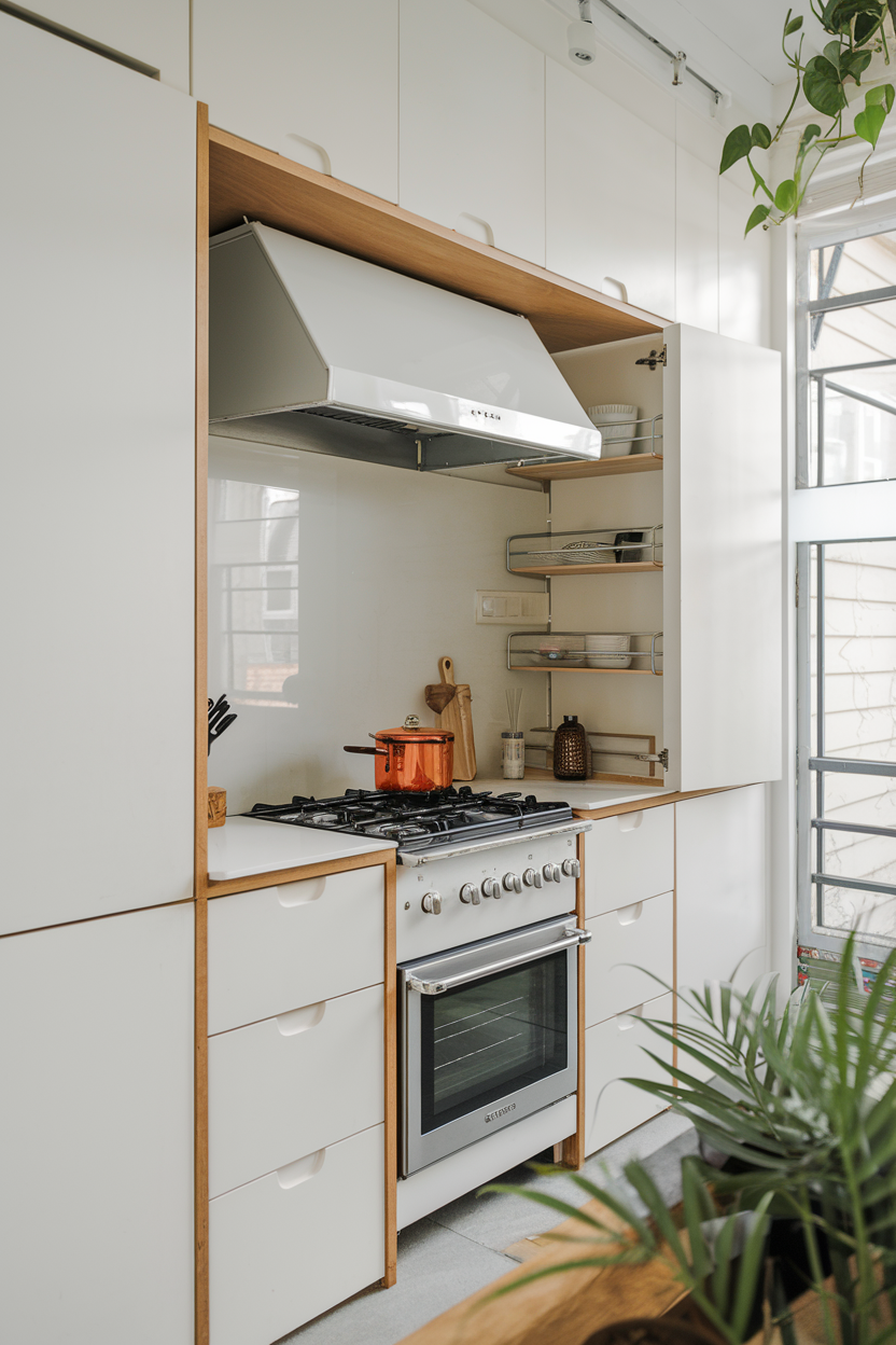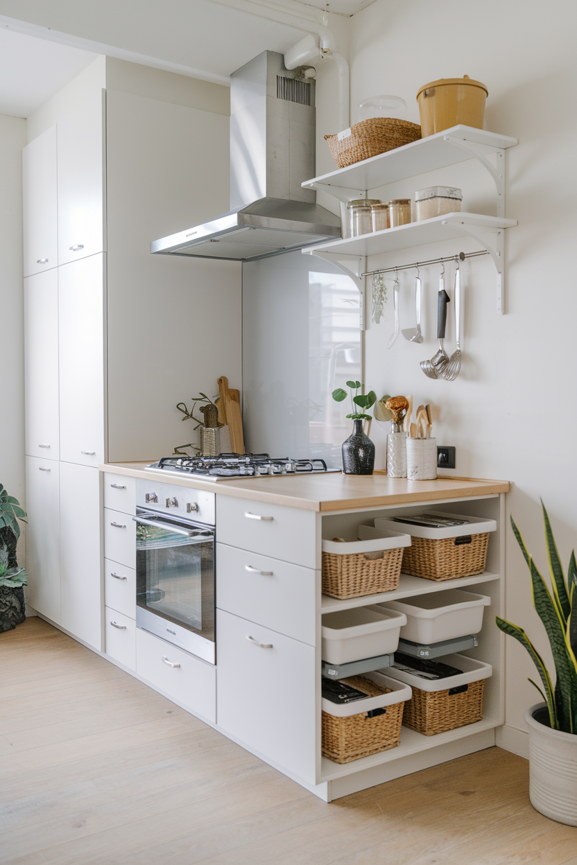 Traditional cabinets can be inefficient in a small kitchen, especially when it comes to deep or narrow spaces. Pull-out pantry drawers are a clever way to make the most of every inch. These drawers slide out completely, giving you full visibility and access to everything stored inside. They’re ideal for narrow cabinets and awkward corners and help reduce clutter while keeping all your pantry items neat and within reach.