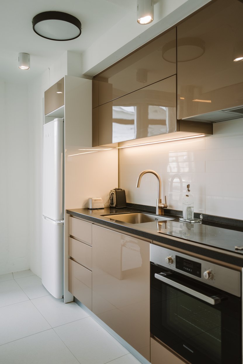 To create a sense of openness and light, use reflective surfaces like high-gloss cabinets, mirrored backsplashes, and polished countertops. These materials help bounce natural and artificial light around the room, making your kitchen appear larger and brighter. Reflective surfaces also add a modern, sleek aesthetic that contributes to the overall elegance of your small kitchen design. Try combining them with under-cabinet lighting for an even greater effect.
