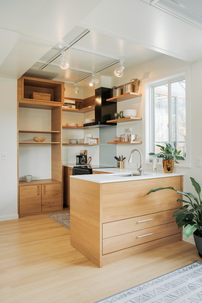 An undermount sink is installed beneath the countertop, creating a seamless transition between sink and counter. This design eliminates the rim found in drop-in sinks, giving you more usable counter space and a sleeker appearance. It also makes cleaning easier, as you can wipe crumbs and spills directly into the sink. In very small kitchens, even small design tweaks like this can make a big difference.