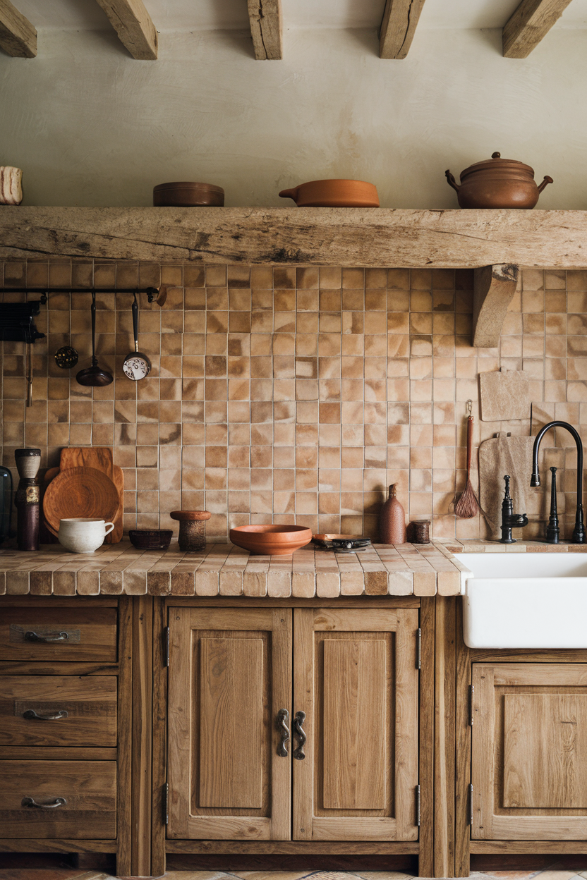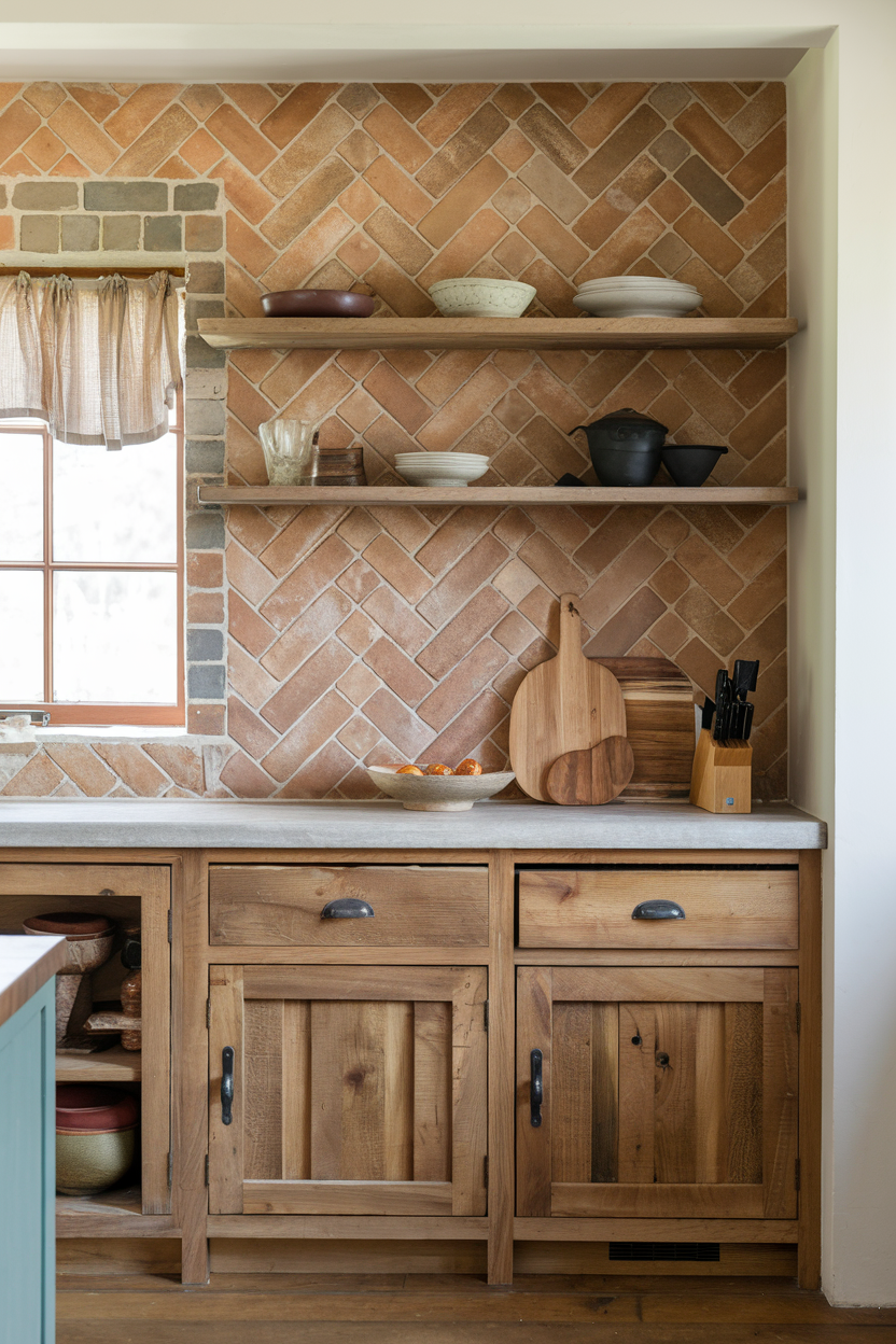 Terracotta tiles offer a rich, earthy palette that instantly grounds the kitchen with warmth and rustic appeal. Their natural orange-red tones feel sun-baked and welcoming, echoing traditional farmhouse materials. Whether laid in a herringbone pattern, stacked, or offset, these tiles bring handcrafted energy into the space, especially when paired with open shelving and copper or brass details.