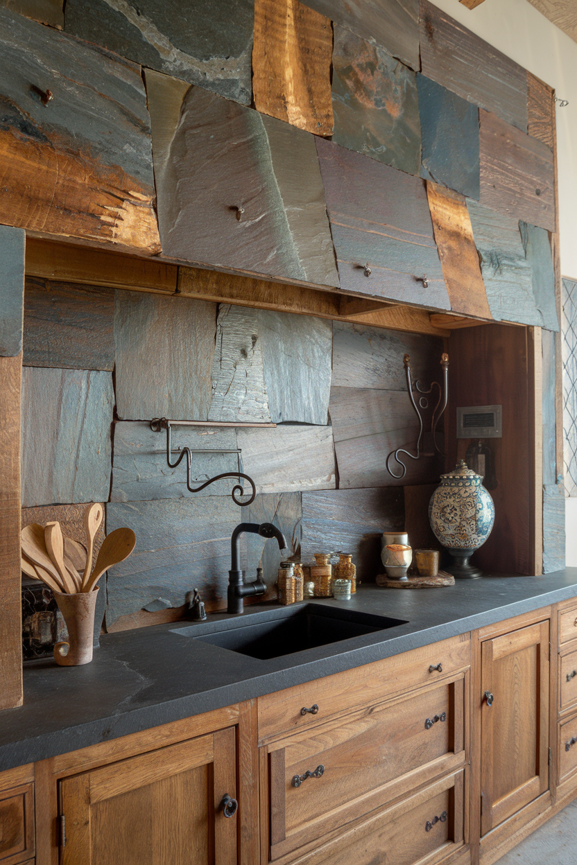 Slate’s deep, natural hues and matte texture make it an ideal backdrop for farmhouse kitchens. When reclaimed or cut into irregular shapes, it takes on an even more rustic personality. The stone’s durability and cool undertones contrast beautifully with warm wood finishes, and its weighty, grounded look complements wrought iron or aged metal hardware perfectly.