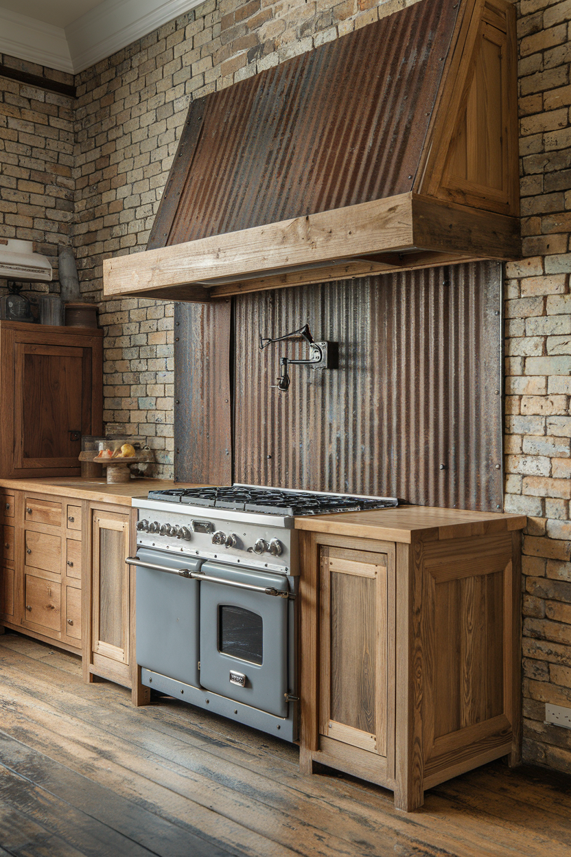 For a bold take on rustic style, corrugated metal sheets bring an unexpected, industrial edge to the farmhouse kitchen. Their rippled texture adds depth and reflection, especially when placed behind a stove or range hood. The raw metallic finish contrasts beautifully with natural wood cabinets or butcher block counters, offering a rugged, utilitarian charm.