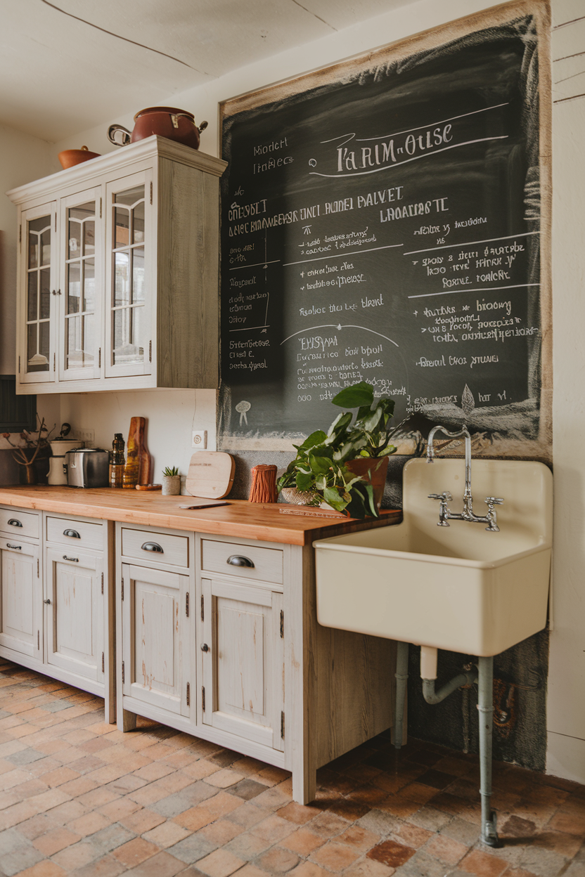 A chalkboard backsplash might not be traditional, but it fits right in with the farmhouse ethos of function meets charm. Painted onto a smooth surface, it provides a writable wall perfect for recipes, menus, or sweet notes. It brings a personal, interactive element to the space and pairs nicely with wood, iron, and vintage accents for a truly homey kitchen feel.