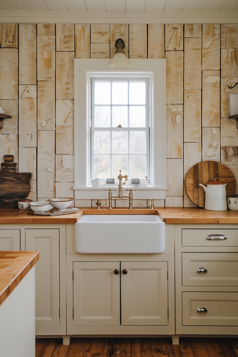 Stone veneer panels create the look of a full stone wall without the weight and installation hassle. They come in various natural hues (think warm tans, soft grays, and creamy whites) and mimic the rugged charm of old farmhouse fireplaces. Installed as a backsplash, they offer a solid, textural presence that contrasts beautifully with smooth countertops and simple cabinetry.