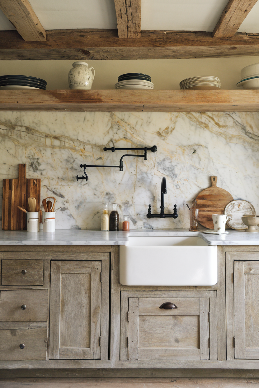 Marble might seem too luxe for a rustic kitchen, but when you choose slabs with a honed or matte finish, it takes on a much more relaxed, approachable tone. The subtle veining in gray or beige adds natural elegance, while the soft sheen complements weathered wood and traditional farmhouse fixtures. It’s a way to introduce luxury without compromising warmth.