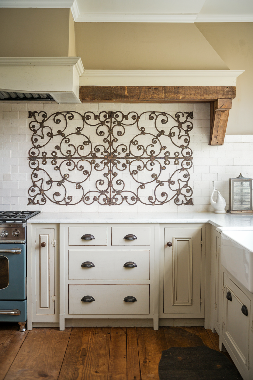 Add a decorative and slightly gothic edge to your backsplash with tiles that feature wrought iron inlays or detailing. These designs evoke the craftsmanship of old farmhouses and European country kitchens, bringing in dark contrast and elegant curves. Use sparingly as an accent behind the stove or sink to make a statement without overpowering the space.
