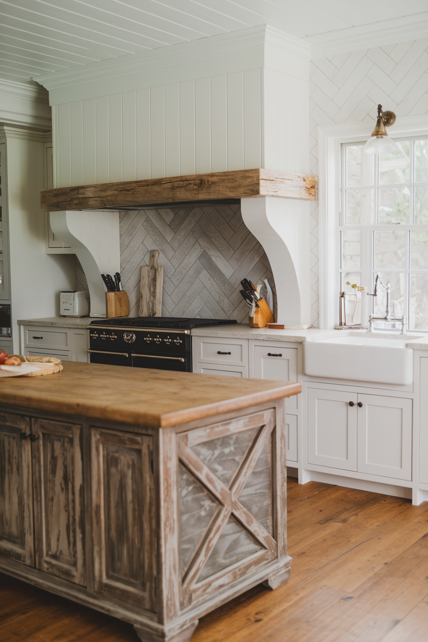 Taking simple materials like wood-look tile or brick and laying them in a herringbone pattern creates a sense of sophistication within the rustic framework. This classic layout injects movement and interest without veering from the farmhouse aesthetic. Use reclaimed wood or elongated bricks in warm tones to create a dynamic yet down-to-earth focal point behind your range or sink.