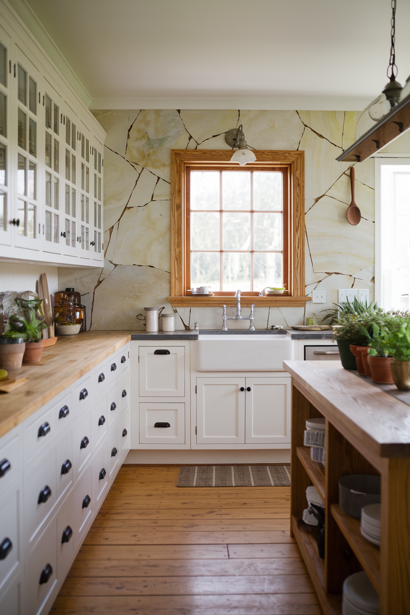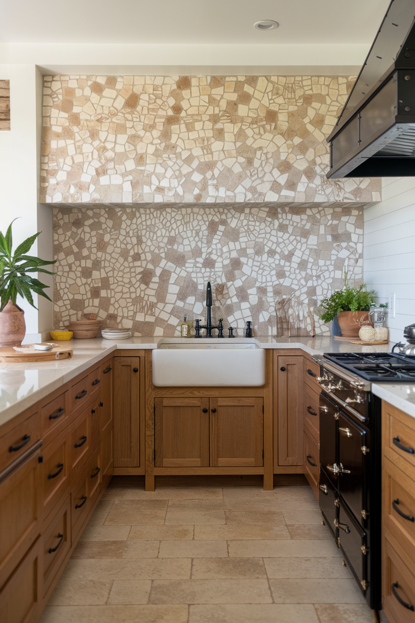 For those who love the raw beauty of natural materials, a mosaic stone backsplash in neutral hues offers both texture and elegance. Stones like travertine, limestone, or even pebbles in cream, sand, or taupe tones create a richly layered backdrop. The variance in color and shape makes the backsplash come alive, while still blending seamlessly with traditional farmhouse elements.