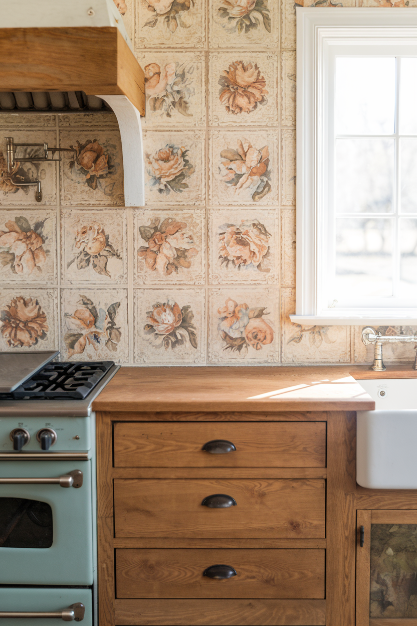 For a DIY-friendly farmhouse look, stenciled floral tiles are a fun and personal way to add pattern and charm. Choose soft, vintage-inspired motifs in faded tones like dusty rose, sage green, or muted blue. This decorative backsplash can transform a plain space into something whimsically rustic and works especially well in breakfast nooks or behind open shelves.