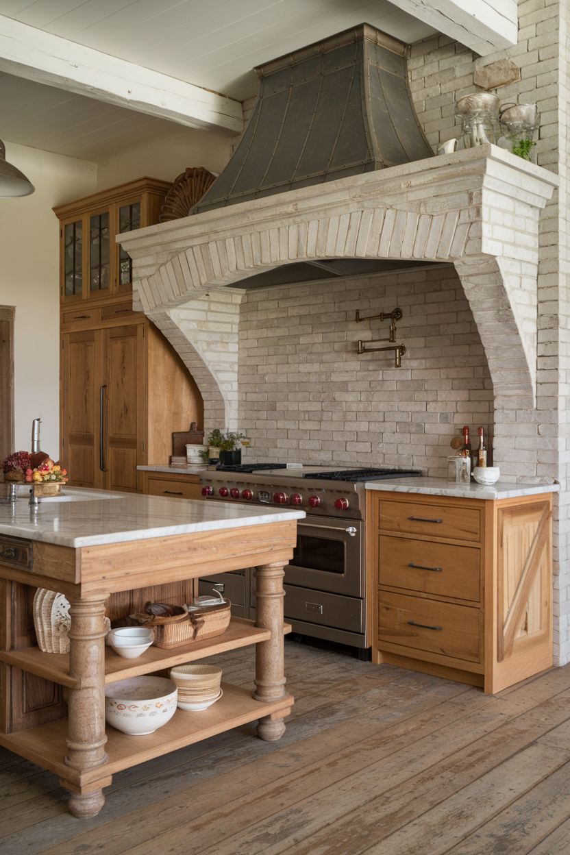 Limestone offers a softer, more muted alternative to traditional red or white brick. Its creamy beige tones and lightly textured surface lend a warm, grounded feeling to farmhouse kitchens. When cut into rectangular bricks and set with a light grout, it creates an understated backdrop that blends easily with other rustic elements, like antique fixtures and woven accents.