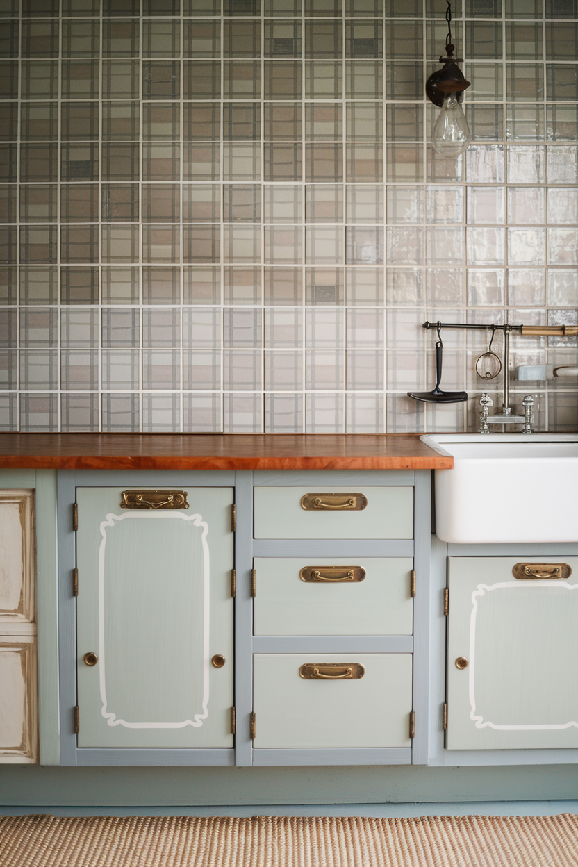 Plaid-patterned ceramic tiles in subtle tones such as taupe, cream, or gray introduce a cozy textile vibe into your kitchen, without actually using fabric. This unique look feels both traditional and tailored, offering a soft contrast to the hard surfaces of stone and wood. It’s perfect for cottage-inspired farmhouse spaces that lean into comfort and quiet detail.