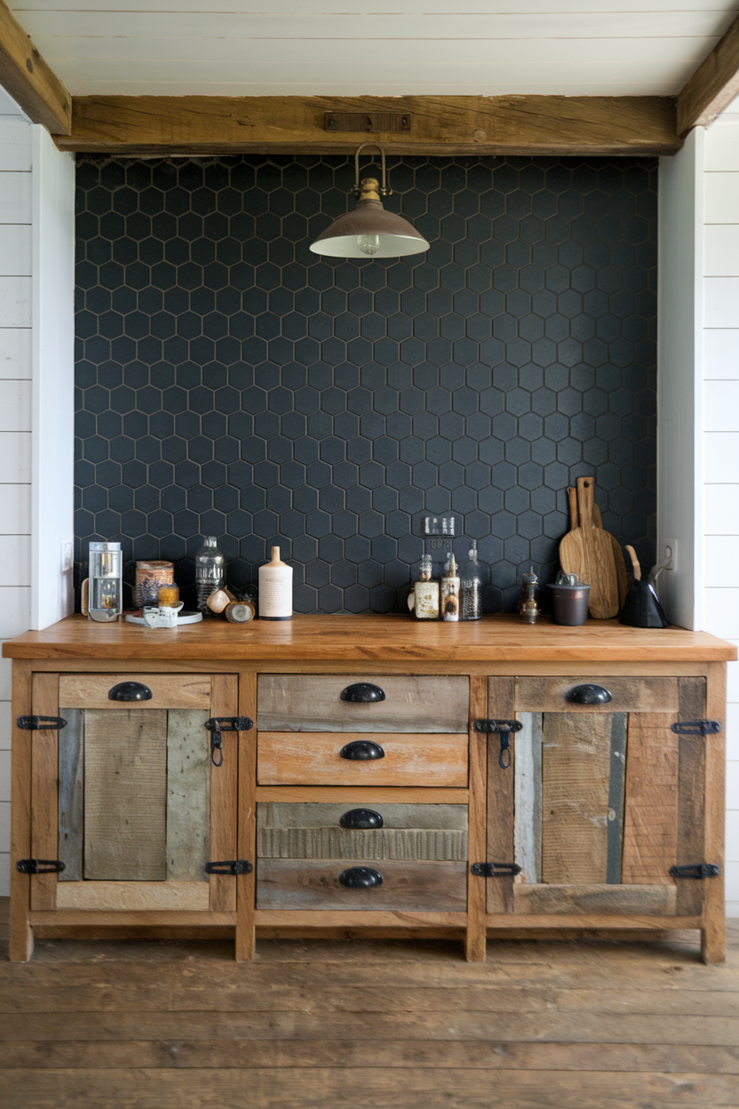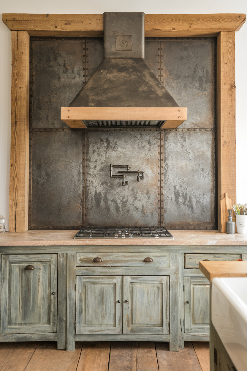 Combining sheet metal, like zinc or galvanized steel, with rustic wood trim can create a unique, layered farmhouse backsplash. The metal brings a raw, industrial edge, while the wood warms it up and ties it back to farmhouse roots. Use this behind a range hood or on a half-wall to add unexpected texture and depth to your space.