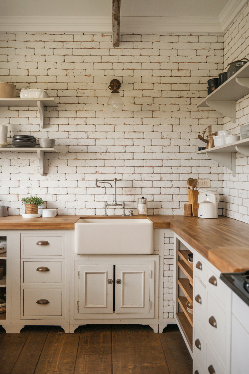 Painted brick gives you the texture and solidity of masonry with a cleaner finish that works well in farmhouse kitchens. Whether you go with crisp white, muted gray, or a soft pastel, painted brick retains the character of the original material while making it feel fresh. Pair it with butcher block countertops and open wood shelves for a cozy, curated space.