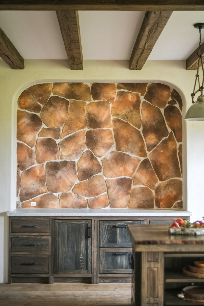 Faux stone panels give you the rugged look of stacked stone without the heavy weight or cost. Choose warm, weathered tones for a realistic finish that enhances the rustic charm of your kitchen. These panels are easy to install and maintain, making them a great option for DIYers who want a high-impact look with farmhouse roots.