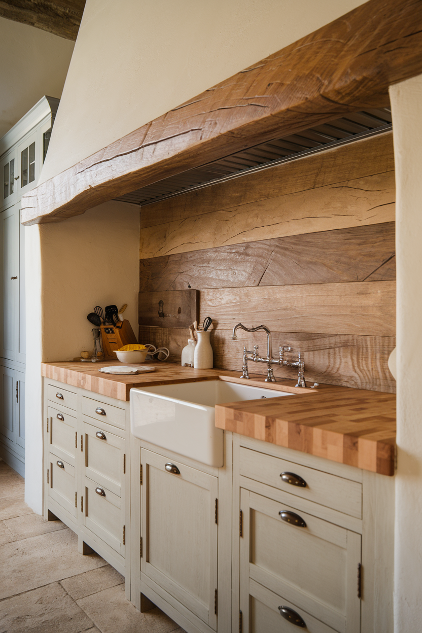 Using butcher block wood as a backsplash may seem unconventional, but it’s a great way to bring warmth and natural texture to the walls. Pair it with matching countertops or just use it behind open shelves to create a sense of continuity. Sealed properly, it offers a durable surface that enhances the rustic, crafted look of farmhouse interiors.