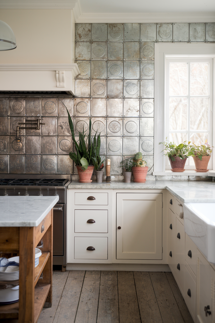 Vintage tin tiles bring a sense of old-world charm and intricate detail that instantly elevates your farmhouse kitchen. Whether you use them in silver, bronze, or aged white, their embossed patterns reflect light in interesting ways, adding both brightness and visual texture. Their slightly reflective surface adds just the right touch of glam while staying true to the rustic roots of farmhouse style.
