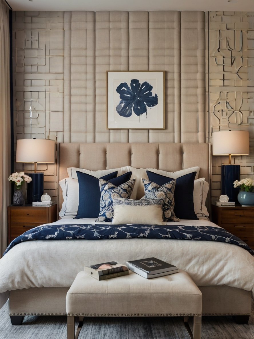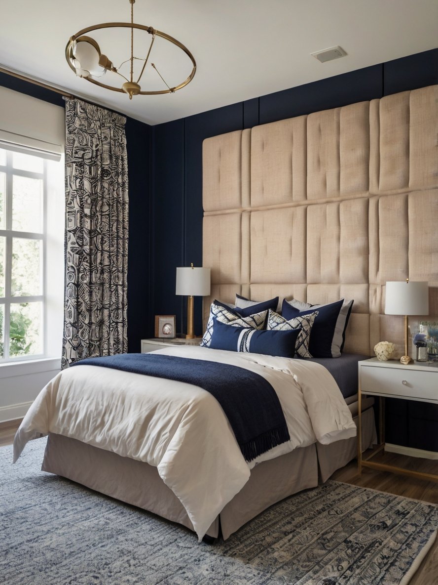 The upholstered wall behind the bed is a bold statement piece that immediately elevates the room’s aesthetic. The light beige fabric creates a subtle contrast against the navy walls, offering warmth and softness to balance the space. The paneled design adds depth and texture, ensuring the wall isn’t just functional but also visually striking. This feature serves as both a headboard and an accent wall, embodying modern luxury. Its muted tone allows the other design elements, such as the navy accents and bold curtains, to shine without overwhelming the space.