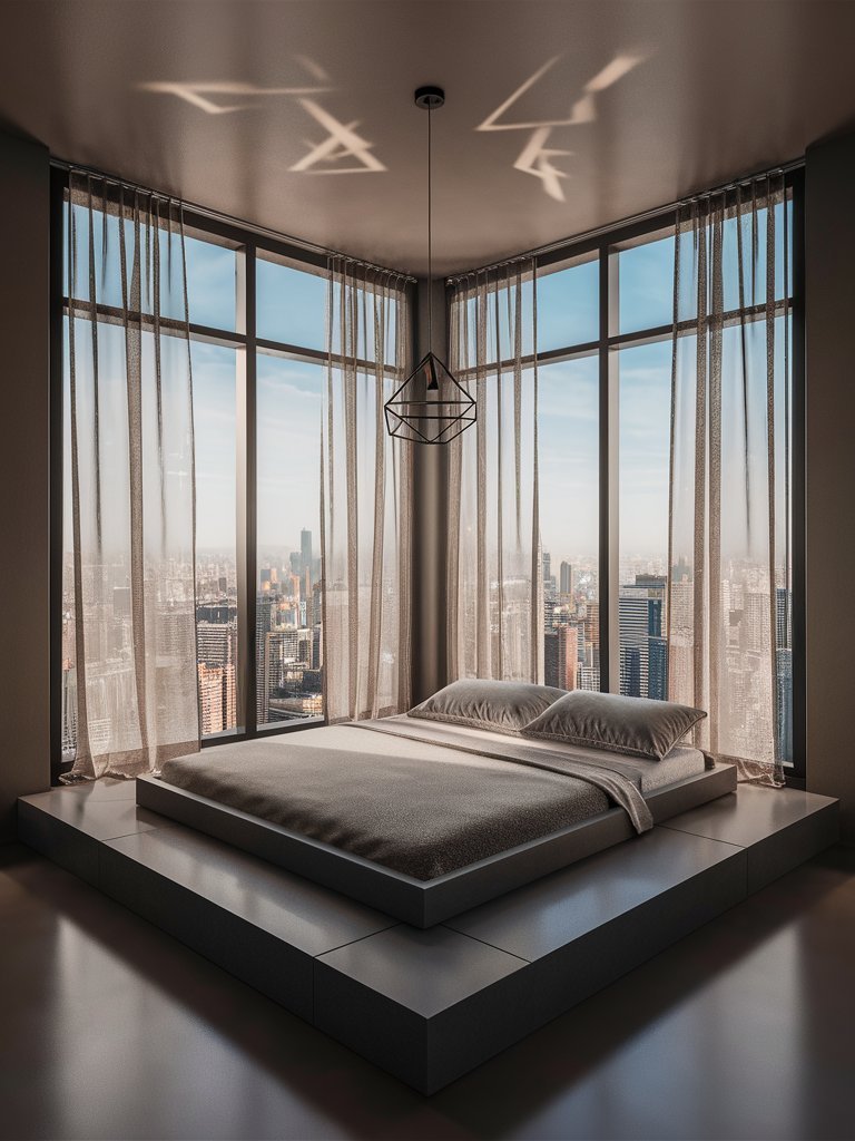 This bedroom perfectly embodies the concept of an urban sanctuary. The minimalist design, combined with expansive city views, creates a space that feels both luxurious and meditative. The lack of clutter emphasizes the room’s purpose as a place of rest and relaxation, offering a much-needed escape from the chaos of city life. Every design element, from the elevated platform to the sheer curtains, contributes to this sense of calm, making the room a retreat for both body and mind.