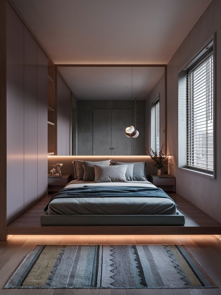 The floating bed design in this bedroom is a testament to modern minimalism, effortlessly blending form and function. Suspended slightly above the floor with concealed lighting underneath, the bed creates an ethereal glow that adds an inviting warmth to the space. This clever use of lighting also gives the illusion of added height, making the room appear more spacious and airy. The clean lines of the bed frame align with contemporary aesthetics, while the neutral bedding complements the overall tone. The muted gray tones of the bedding exude calmness and sophistication, allowing the bed to become the centerpiece of the room. It’s a perfect blend of luxury and comfort, making the space ideal for unwinding after a long day. The subtle interplay of textures, from the soft fabric of the duvet to the sleek finish of the bed frame, adds depth to the design without overwhelming the minimalistic approach.