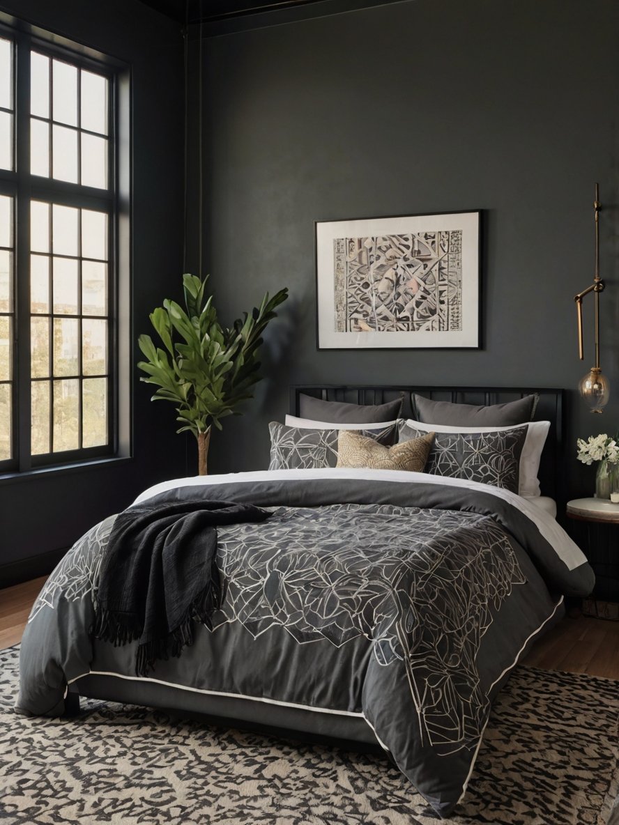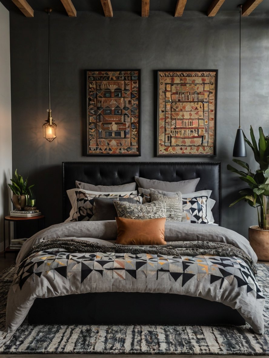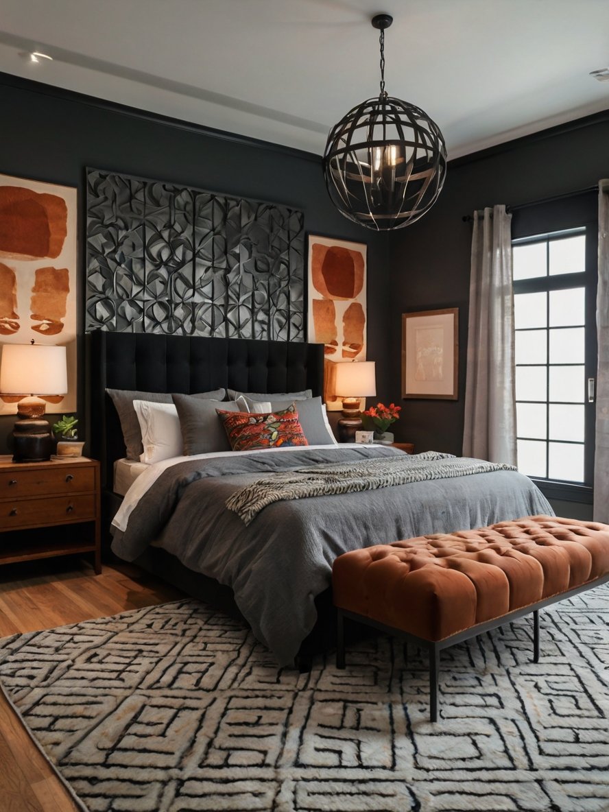 This bedroom masterfully balances bold and neutral tones to create a striking yet cozy ambiance. The deep charcoal walls add depth and drama, contrasting beautifully with the warm rust accents found on the tufted bench and throw pillows. The black upholstered headboard seamlessly blends with the wall, ensuring the room maintains cohesion. The choice of color conveys a moody sophistication that feels inviting rather than overwhelming. While the palette leans dark, it avoids feeling cold due to the thoughtful addition of warm tones that soften the overall look. The subtle warmth woven throughout the design adds a welcoming vibe to the space, making it feel like the perfect retreat.