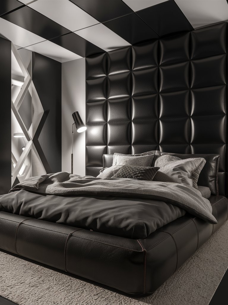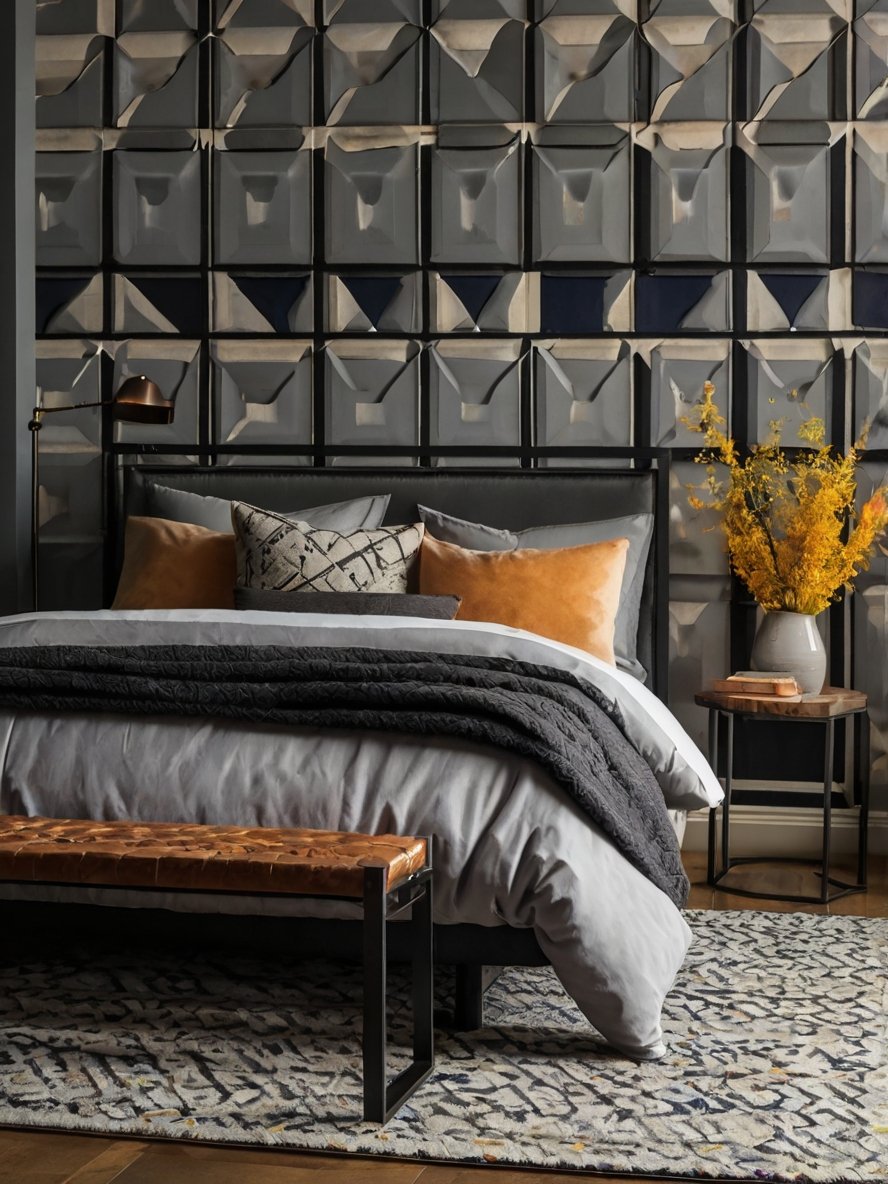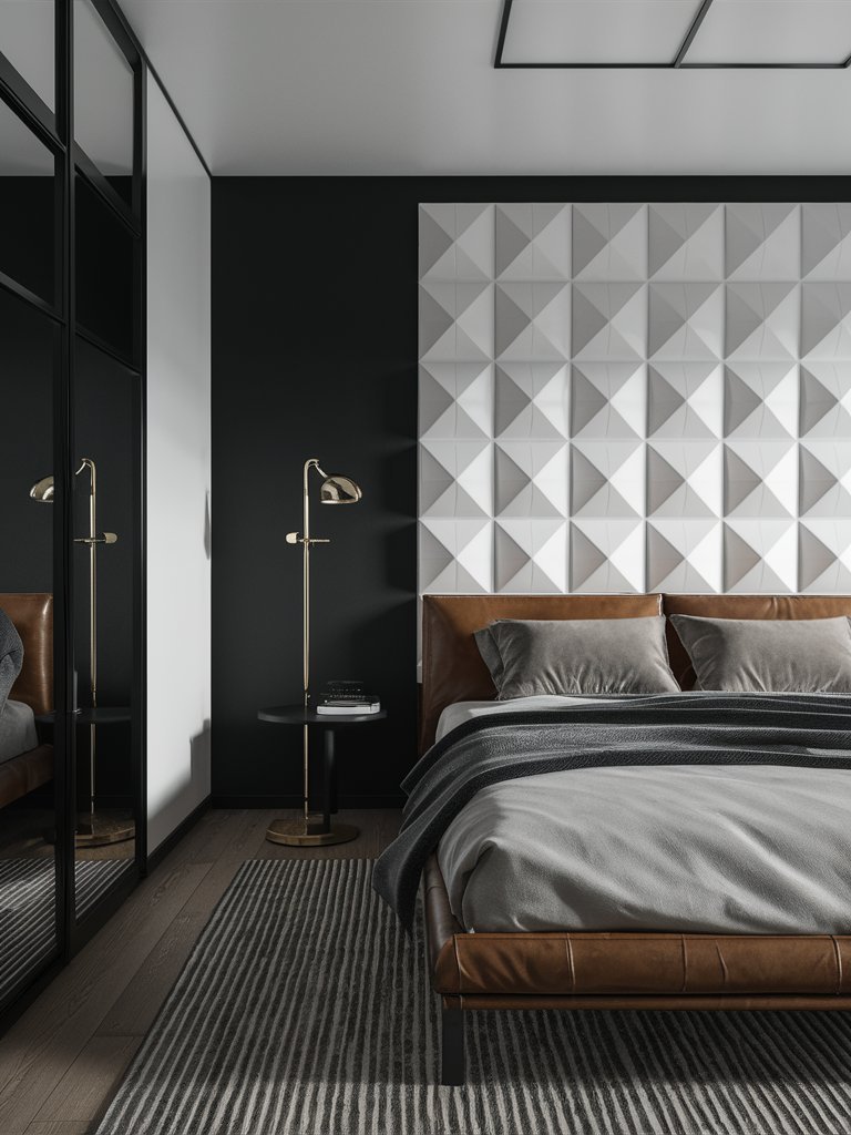 The standout feature of this bedroom is undoubtedly the geometric accent wall, which creates an immediate sense of depth and texture. The dark, muted tones of gray and blue are perfectly balanced, forming a bold yet sophisticated statement. The raised 3D effect adds a sculptural quality, making the wall a piece of art in itself. This feature commands attention without overwhelming the room, offering a dramatic focal point while complementing the other modern design elements.