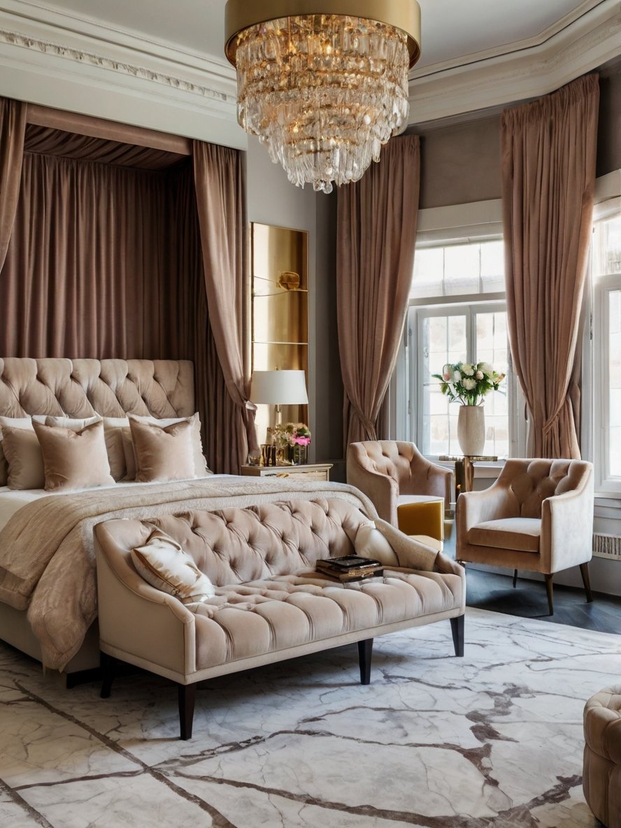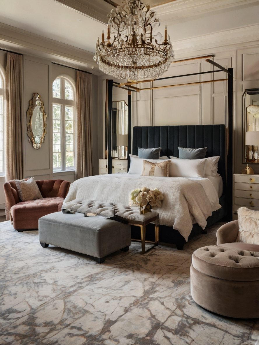 The inclusion of multiple seating options in this bedroom reflects a thoughtful design and adds an inviting layer of coziness. From the tufted armchairs to the upholstered ottoman, every piece is both functional and aesthetic. The seating area creates a separate zone within the bedroom, perfect for relaxation, reading, or enjoying a quiet cup of coffee. The warm tones of the seating fabric harmonize with the neutral palette of the room, ensuring a balanced and tranquil atmosphere. This approach enhances the bedroom’s functionality without compromising its elegance.