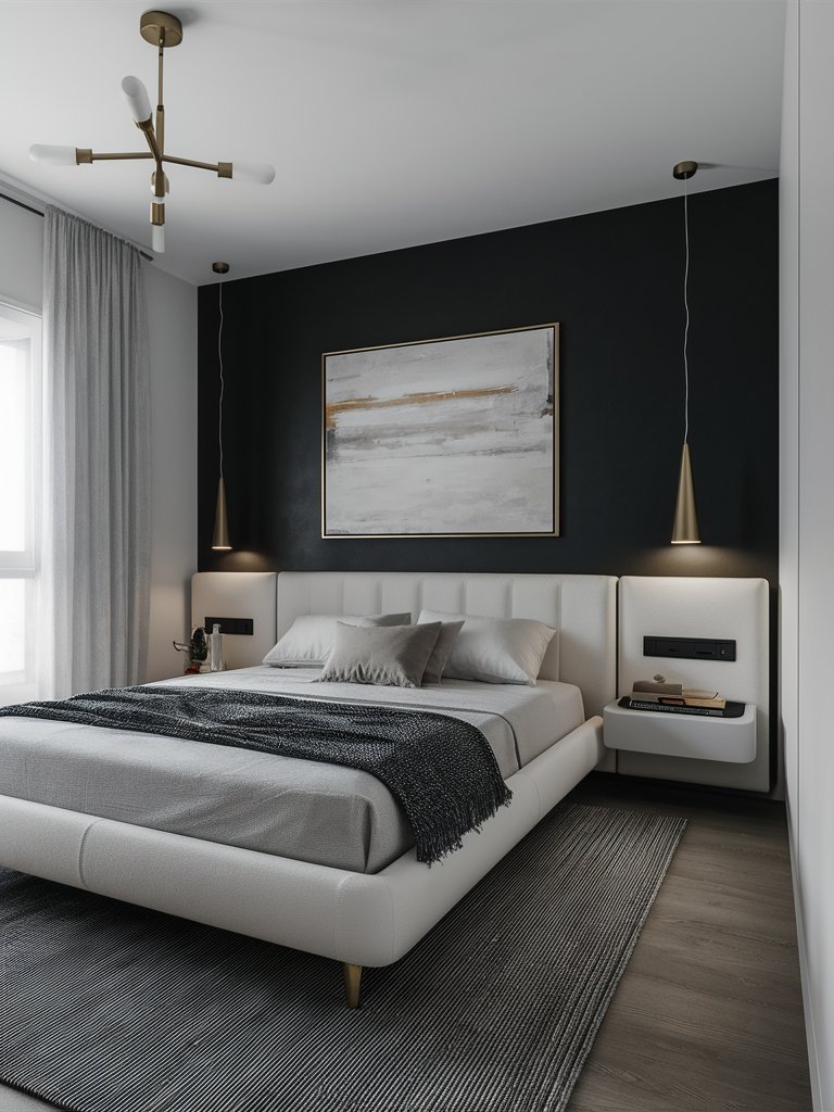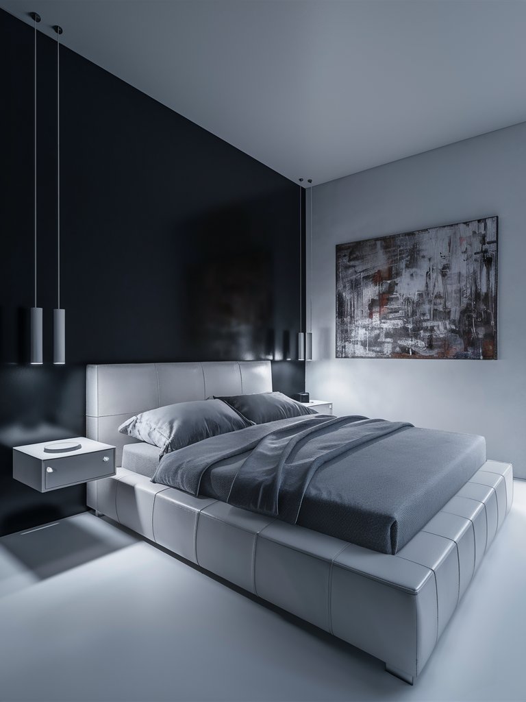 This bedroom’s monochromatic color scheme is a bold testament to the power of simplicity. The interplay of black, white, and gray throughout the space creates a serene yet sophisticated atmosphere. The black accent wall is an impactful choice, anchoring the room and drawing attention to the bed as its focal point. Meanwhile, the lighter shades of gray on the floor and bed help balance the darker tones, ensuring the room doesn’t feel overly heavy or enclosed. This careful layering of hues demonstrates that a restricted palette, when applied thoughtfully, can create a space that is both visually engaging and calming. The absence of bold colors further emphasizes the room’s modernist aesthetic, allowing the textures and shapes to take center stage. Overall, this monochrome approach is a masterclass in achieving harmony through simplicity.