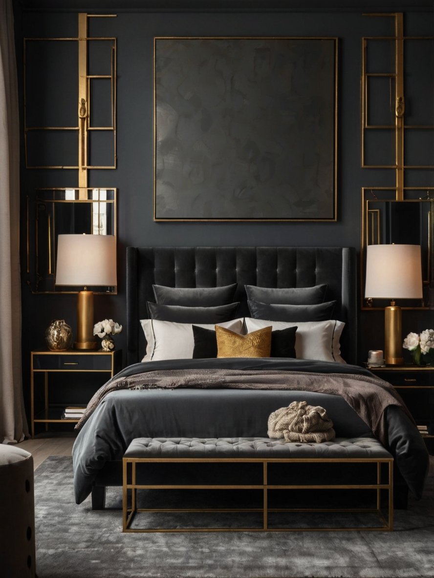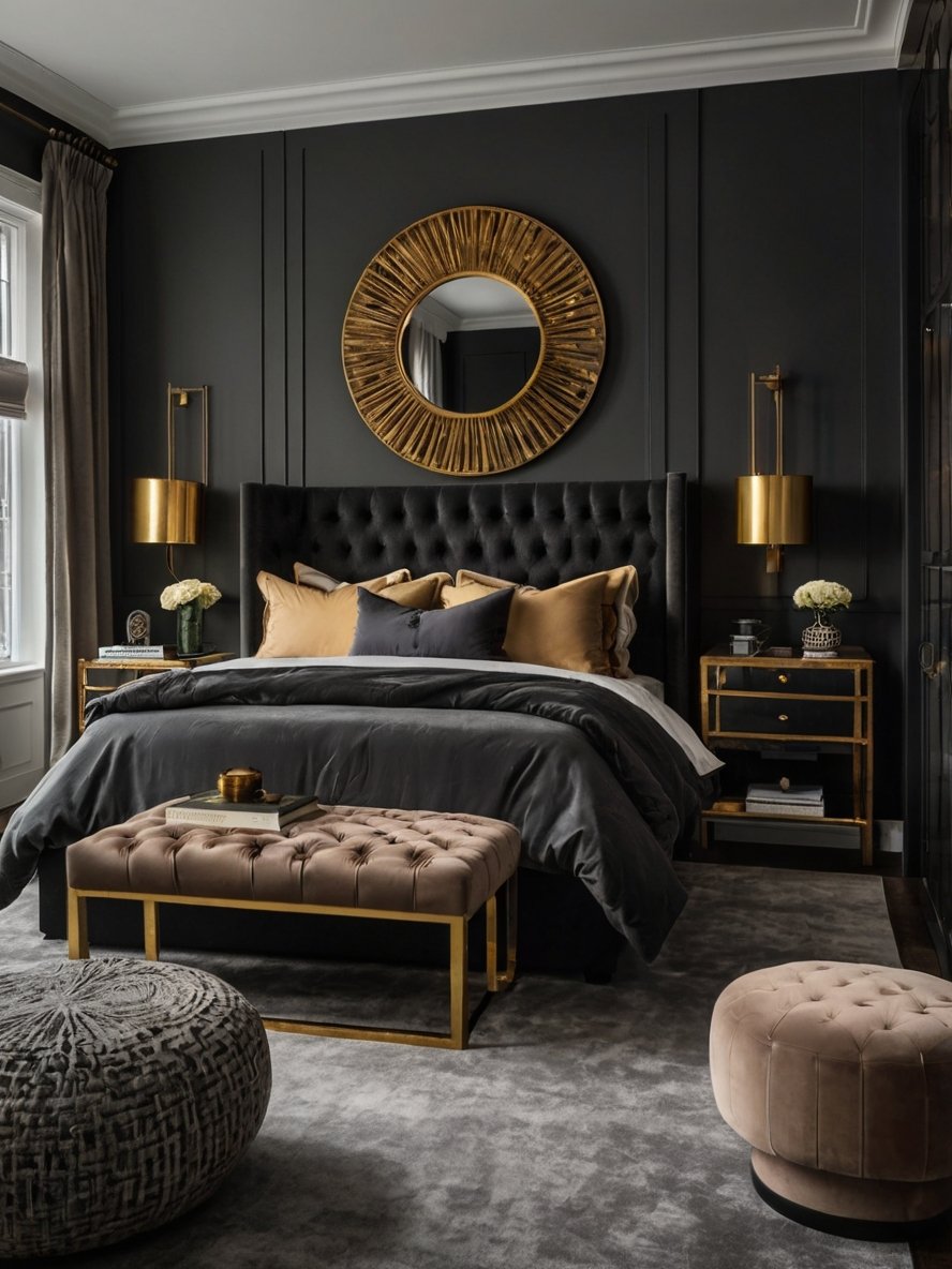 The bold black walls in this bedroom set a striking tone, creating a dramatic and intimate atmosphere. This choice allows every other element in the room to stand out with greater intensity. The matte finish adds depth without reflecting light, keeping the space moody yet sophisticated. Paired with subtle paneling, the walls introduce texture and dimension, making the dark palette visually engaging. The color choice also emphasizes the golden and bronze accents in the room, elevating its luxurious feel.