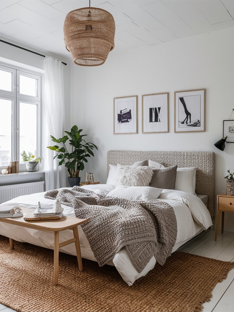 The color palette of this bedroom revolves around soft, neutral tones, creating a serene and timeless atmosphere. White walls, beige accents, and natural wood elements blend seamlessly to evoke warmth and comfort. The neutral scheme is far from monotonous, as the varying textures and subtle contrasts add depth and interest. The strategic use of accent colors, such as the green from the plant and the earthy tones of the jute rug, prevents the space from feeling sterile. This carefully curated palette is a testament to the power of simplicity in modern design, where every detail serves a purpose.