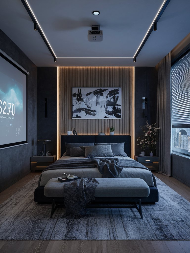 This bedroom’s dark, moody color palette exudes sophistication and intimacy. The use of deep gray tones on the walls and bedding establishes a luxurious atmosphere, perfect for unwinding after a long day. The monochromatic scheme is elevated by subtle variations in texture, such as the plush rug and sleek curtains, which prevent the design from feeling flat. The dark hues also serve as a backdrop to highlight the brighter accents, like the integrated lighting and abstract artwork, creating a stunning visual contrast.