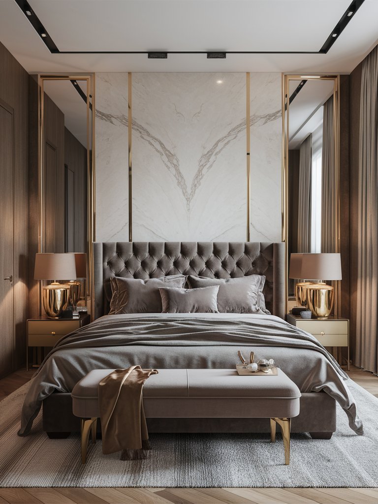 The most striking feature of this bedroom is undoubtedly the marble accent wall behind the bed. The natural veining in the marble, combined with its neutral white base, adds a sense of grandeur and sophistication. Enhanced by the subtle gold framing, the wall creates a focal point that is both luxurious and timeless. Marble is often associated with elegance, and its use here ensures that the room maintains a polished and upscale look. The lighting complements the marble’s texture beautifully, making it the standout feature.